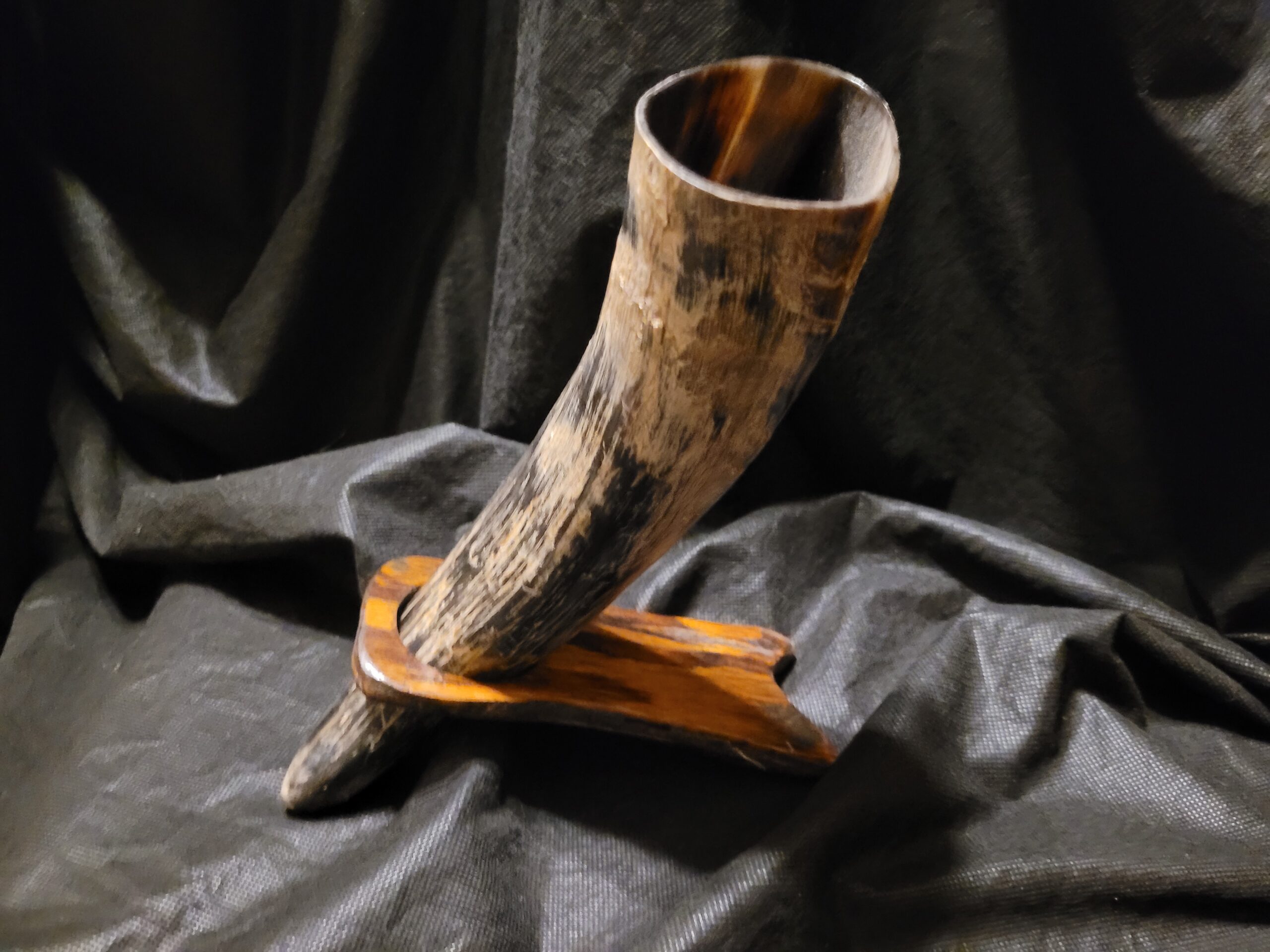 Unadorned genuine horn. Stand carved in-house—raw, functional design. Unknown origin, now Whiteworld-ready. Simplistic but sturdy.